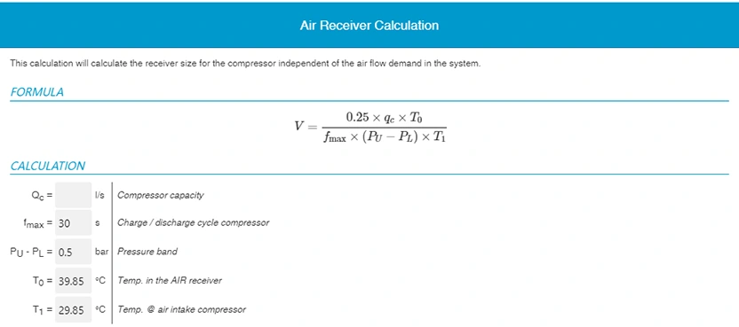 Минимизация колебаний/падений давления: Резервуар для приема воздуха используется для минимизации колебаний давления, которые могут повлиять на производственный процесс и качество продукции. При выборе подходящего воздухоприемника для вашего компрессора необходимо учитывать два значения: выходное давление компрессора и требования применения в месте использования. Обратите внимание, что сжатый воздух, хранящийся в воздухоприемнике, полезен только тогда, когда его давление достаточно для поддержания соответствующего процесса. Поэтому необходимо учитывать продолжительность, в течение которой воздухоприемник подает газ под давлением, требуемым конечным потребителем/оборудованием (в минутах).