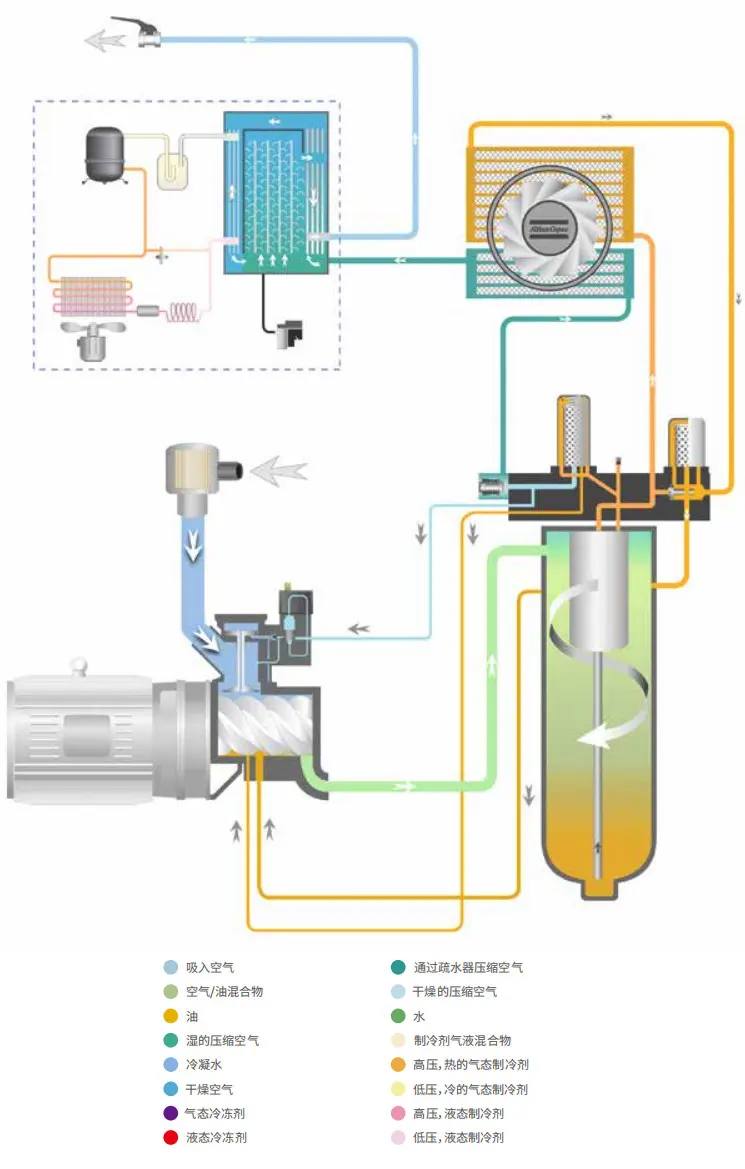 ·Водоотделитель в дополнительном охладителе может в основном удалять воду. В стандартную комплектацию входит электронный сливной клапан для автоматического дренажа и снижения потерь сжатого воздуха.